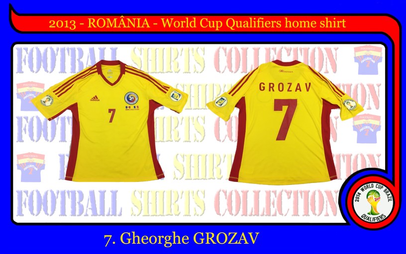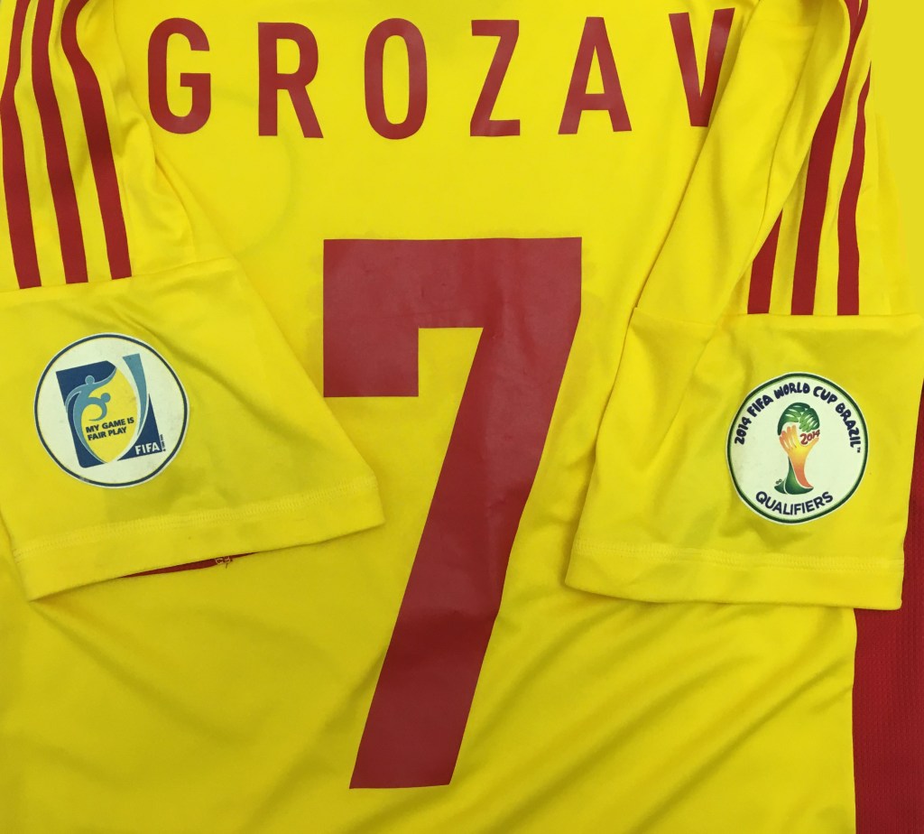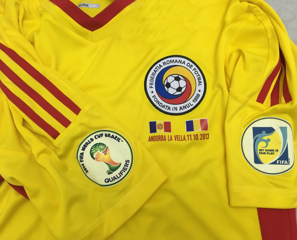 Tricou Adidas cu patch-uri de “FIFA WC 2014 Qualifiers” și “My game is fair play” și detaliile meciului în care a fost purtat, deplasarea din Andorra (11 octombrie 2013) câștigat cu 4-0, goluri marcate de Claudiu Keșeru, Bogdan Stancu, Gabriel Torje și Costin Lazăr.