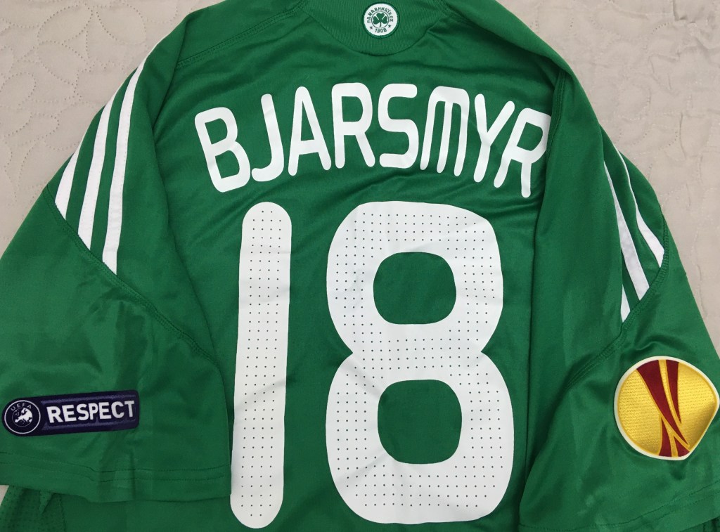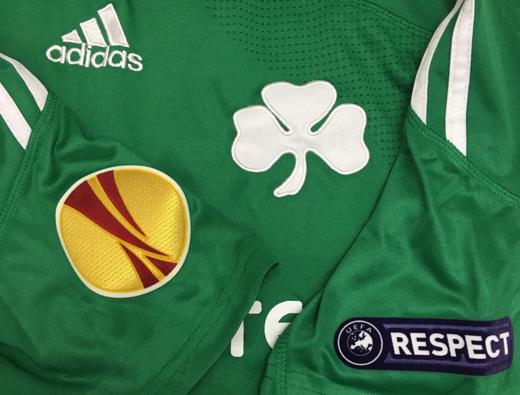 Tricou Adidas (made in Greece), model de “acasă”, cu patch-urile de “UEFA Europa League” și “Respect” pe umăr, aparținându-i lui Mattias Bjärsmyr.