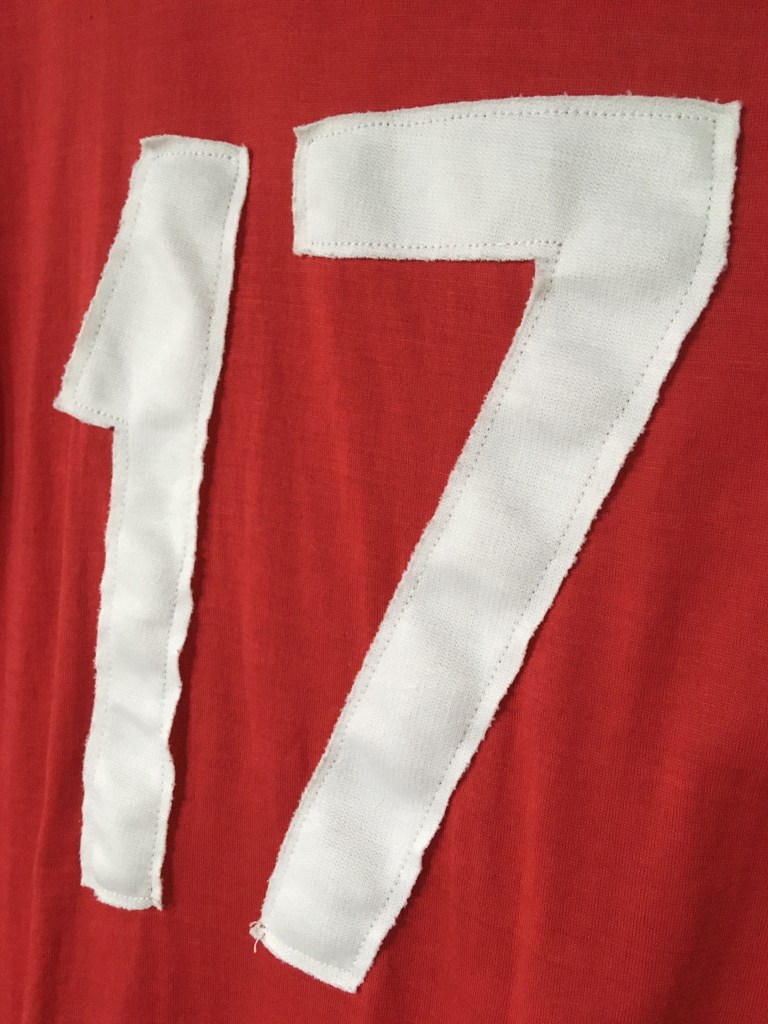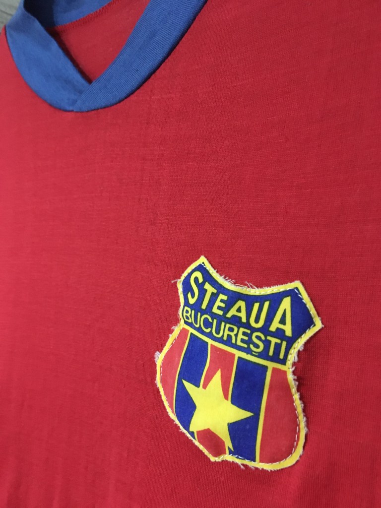 Tricou roșu de bumbac cu guler si mâneci albastre, cu sigla și numerele de pe spate cusute, provenit de la RetrOriginal Football, care afirmă că tricoul a fost primit de un angajat al clubului FC Brugges în urma meciului tur dintre cele două echipe.