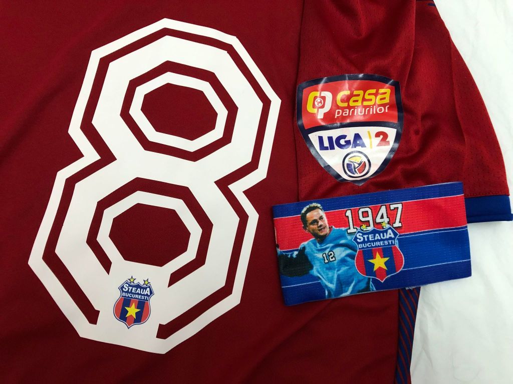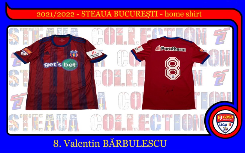 După 18 ani Steaua revine la echipamente Adidas! Model Aeroready, cu dungi albastre, folosit la meciurile de pe teren propriu, prezintă numărul 8, al căpitanului Vali Bărbulescu, sponsorii Get’s Bet (pe piept), Porotherm (pe spate, deasupra numărului) și International Alexander pe umărul stâng. Pe umărul drept regăsim emblema de Liga 2.