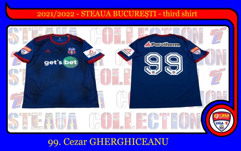 După 18 ani Steaua revine la echipamente Adidas! Model Aeroready, albastru, folosit într-un singur meci amical (3-0 cu CSO Retezatul Hațeg, 9 decembrie 2021), prezintă numărul 99, al atacantului Cezar Gherghiceanu, sponsorii Get’s Bet (pe piept), Porotherm (pe spate, deasupra numărului) și International Alexander pe umărul stâng. Pe umărul drept regăsim emblema de Liga 2.