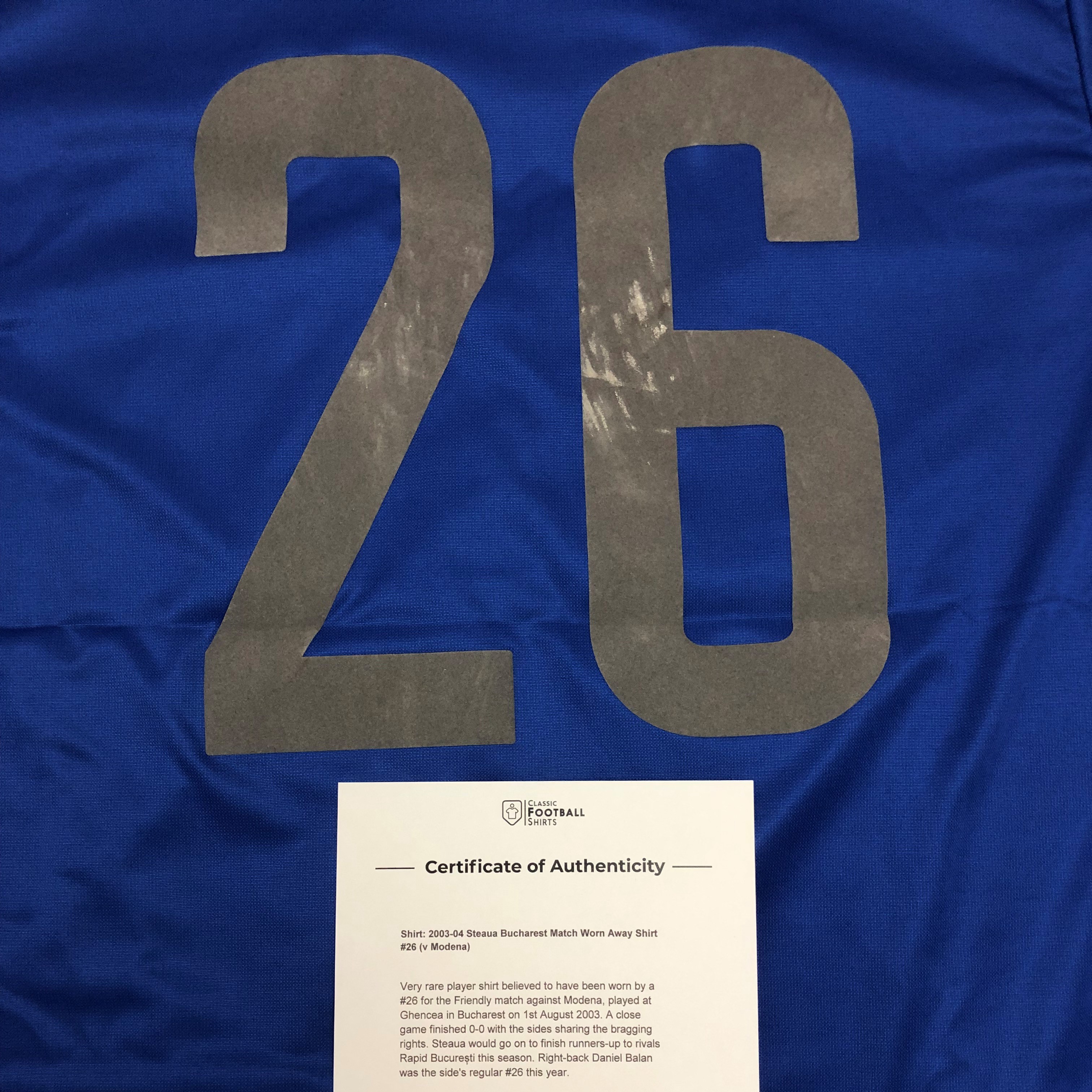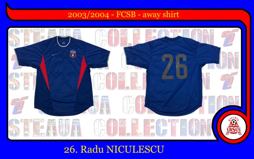 Tricou Nike pregătit pentru Radu Niculescu în amicalul cu Modena de pe 1 august 2003, primit la schimb de un jucător italian, care furnizează și o scrisoare de autenticitate celor de la Classic Football Shirts, ce folosește noua siglă a Fotbal Club Fcsb, o copie a siglei Stelei anilor ’70-’80-’90. Între timp, drepturile de folosire a siglei sunt recuperate de către colonelul Florin Talpan și este folosită pentru echipa de fotbal a clubului militar după reînființarea din 2017.
