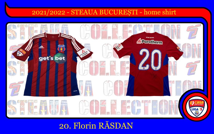 După 18 ani Steaua revine la echipamente Adidas! Model Aeroready, cu dungi albe, folosit la meciurile de pe teren propriu, prezintă numărul 20, al veteranului Florin Răsdan, sponsorii Get’s Bet (pe piept), Porotherm (pe spate, deasupra numărului) și International Alexander pe umărul stâng. Pe umărul drept regăsim emblema de Liga 2.