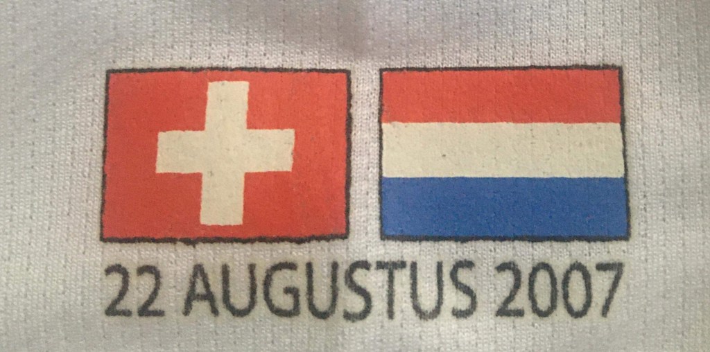 Tricou Nike folosit/pregătit pentru meciul amical cu Elveția din 22 august 2007, imprimat cu detaliile meciului pe mânecă.