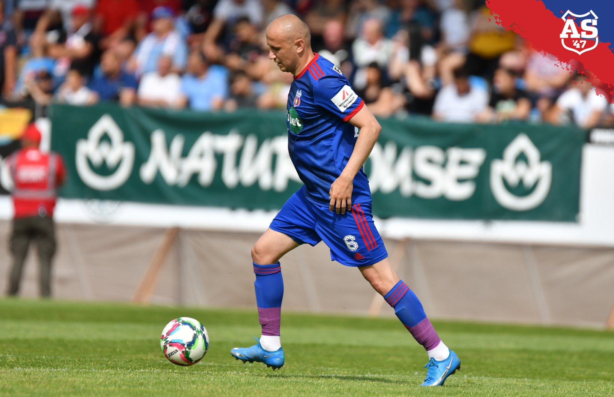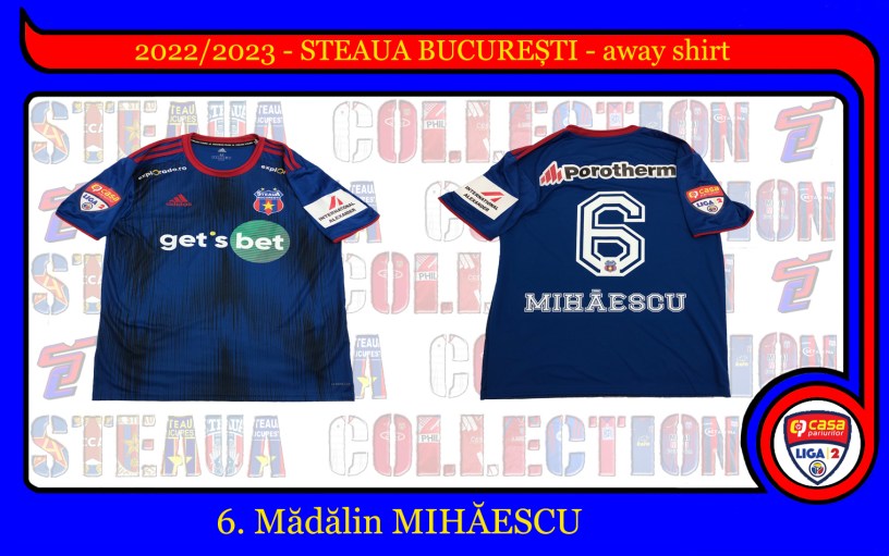 Același model Adidas Aeroready, cu dungi albastre, folosit la meciurile de deplasare ca și în sezonul trecut, prezintă numărul 6 și este imprimat cu numele lui Mihăescu sub număr, sponsorii Get’s Bet (pe piept), Porotherm (pe spate, deasupra numărului), Explorado (pe clavicule) și International Alexander pe umărul stâng. Pe umărul drept regăsim emblema de Liga 2.