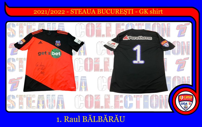 După 18 ani Steaua revine la echipamente Adidas! Model Aeroready de portari, cu mânecile tăiate, prezintă numărul 1 pe spate și sponsorii Get’s Bet (pe piept), Porotherm (pe spate, deasupra numărului) și International Alexander pe umărul stâng. Pe umărul drept regăsim emblema de Liga 2. Tricoul a fost într-un final semnat de către Raul.