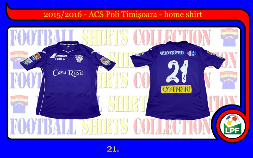 Tricou de joc Joma folosit la meciuri de acasă, cu sponsorul principal Casa Rusu pe piept și Tarom deasupra sponsorului tehnic, respectiv Carrefour deasupra numărului și Cotnari sub număr pe verso. Pe umeri prezintă siglele municipiului Timișoara și sigla LPF. Deoarece în meciurile de campionat, tricourile prezentau și numele jucătorului, probabil tricoul a fost folosit fie în meciurile de pregătire din ianră, ori în meciurile de pregătire din vară înainte de sezonul 2016-2017.