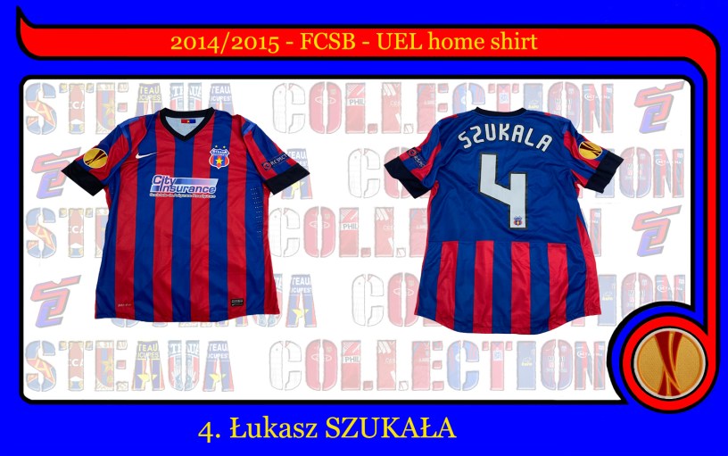 Tricou Nike de joc aparținând lui Łukasz Szukała. Prezintă pe lângă sponsorul principal City Insurance pe piept și pe umeri siglele Europa League și Respect, specifice cupelor europene. Conform informațiilor, tricou este cel folosit de polonez în partida cu AaB Aalborg (6-0, 18.09.2014, meci 1 din grupe), dar Fcsb a purtat modelul și în partidele cu Dinamo Kiev (1-3, 2.10.2014, meci 2 din grupe), Rio Ave (2-1, 23.10.2014, meci 3 din grupe) și din nou, Dinamo Kiev (0-2, 11.12.2014, meci 6 din grupe) .