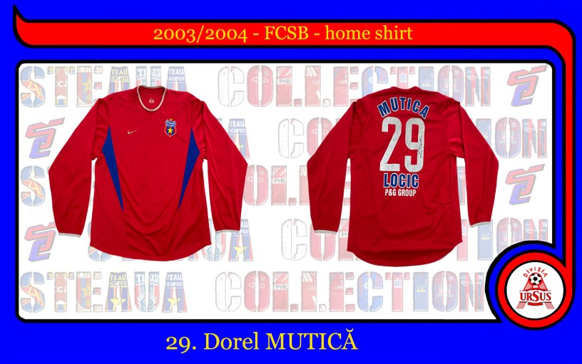 Tricou Nike purtat de Dorel Mutică în partida din deplasare cu FC Argeș (0-0, 5 octombrie 2003, etapa 8), unul din singurele două meciuri în care sponsorul este cu font albastru (celălalt meci este cel din Cupa României contra Chimiei Craiova, însă Mutică a folosit mânecă scurtă), ce folosește noua siglă a Fotbal Club Fcsb, o copie a siglei Stelei anilor ’70-’80-’90. Între timp, drepturile de folosire a siglei sunt recuperate de către colonelul Florin Talpan și este folosită pentru echipa de fotbal a clubului militar după reînființarea din 2017.